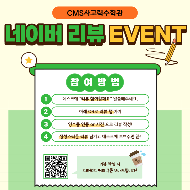 안녕하세요, CMS 목동 사고력수학관 목동쌤입니다! 푸르름이 더해가는 4월입니다. 기분 좋은 봄바람과 함께 우리 아이들의 학습 열기도 나날이 뜨거워지고 있는데요. 학업에 집중하는 재원생들과 입학 상담을 위해 방문해 주시는 학부모님들 덕분에 활기찬 4월을 보내고 있습니다. 보내주시는 따뜻한 성원에 보답하고자, 소중한 의견을 남겨주시는 모든 분께 스타벅스 커피 쿠폰을 드리는 네이버 플레이스 리뷰 이벤트를 진행합니다! 선착순 30명에게 스타벅스 커피 기프티콘을 드립니다. 참여대상 현재 CMS 목동 사고력수학관을 믿고 보내주시는 재원생 학부모님! 여름학기 입학테스트 및 상담을 위해 방문해 주신 신입생 학부모님! 이벤트 기간....... <img src="https://blogthumb.pstatic.net/MjAyNjA0MjFfMTU5/MDAxNzc2NzY0NDgzNzIw.mUvly8iLNWKlnh-yHFq_OcLhqYMzc2D7dMc8urFuVXQg.xkYIPLNSr0-WWbqvzF7Rramt0LAFikRhhrXSwyE17cAg.PNG/260413_%B3%D7%C0%CC%B9%F6%B8%AE%BA%E4-_%BA%B9%BB%E7%BA%BB_%281%29.png?type=s3" />