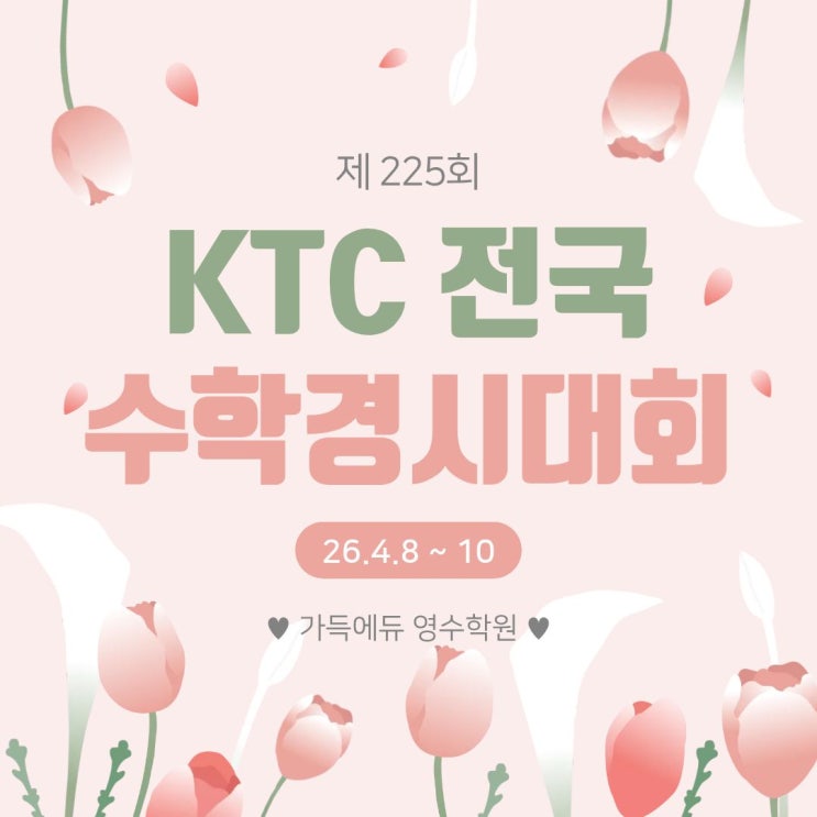 안녕하세요. 가득에듀입니다.!^^ 2026년 제225회 4월 KTC전국수학경시대회를 진행합니다.! <시험범위> 초 3~6 : 전학년 1~2학기 1~2단원 중1 : 전학년 1학기 1단원 이번 달에도 어김없이 아이들이 기다리고, 또 한편으로는 긴장하는 KTC 수학경시대회가 진행됩니다! 매달 치르는 시험이지만 아이들에게는 늘 쉽지 않은 도전입니다. 단순히 문제를 푸는 시험이 아니라 지금까지 배운 내용을 얼마나 정확하게 이해하고 있는지 시간 안에 얼마나 집중해서 풀어낼 수 있는지를 확인하는 중요한 과정이기 때문입니다. 특히 경시대회는 평소 학습보다 조금 더 깊이 있는 문제들이 나오기 때문에 개념이 정확한지 응용력이 얼마나 되는지 실수 없....... <img src="https://blogthumb.pstatic.net/MjAyNjA0MDhfMjIy/MDAxNzc1NjIzNDM5OTM2.Sfb7Lq1Q4kyWupZJjsUq3dOfyNmG3AxDS7qVNjs4imcg.295sghsuMEL1gF5rdsQpw6Tc04gadOAEcbL5CRug8Ccg.JPEG/26.4%BF%F9.jpg?type=s3" />