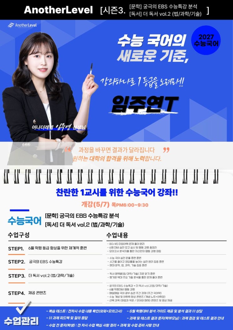 수능 1교시 국어! 찬란한 1교시를 위한 수능국어 강좌!! 고3 국어 임주연T 강좌 안내 개강일 : 5/7(목) 18:30~22:00 <어나더레벨> 어나더레벨 수능국어 3/7(목)시즌3 개강 pm6:30~10:00 <시즌3 - 8주> [문학] 궁극의 EBS 수능특강 분석 [독서] 더 독서 vol.2 (법/과학/기술) ○ 6월 학평 등급 향상을 위한 체계적 훈련 - 실전 감각을 향상하기 위한 실전 모의고사 실시 - 실제 시험장에서 적용할 수 있는 행동 강령 총정리 ○ 궁극의 EBS 수능특강 - EBS 연계 지문을 통한 문학 독서 핵심 원리 및 개념 완성 - EBS 문학, 독서 모든 작품, 지문 분석 자료 및 문제 제공 - 수능과 내신을 한 번에 정복하는 최고의 콘텐츠 ○ 더 독서 vo....... <img src="https://blogthumb.pstatic.net/MjAyNjA0MTlfMTgw/MDAxNzc2NjAwNDcyODU3.b0vkvU4PtUCoEZ0RsvMP38vIUvbnGW2RYLjXjn8FMo8g.8RXo4D1IMlt_QL2SCmOPcpyQjIziEh3sslmlgr0hjCYg.JPEG/4.jpg?type=s3" />