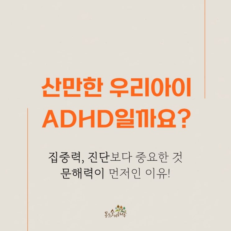 안녕하세요. 동화숲 배움나무 국어논술학원입니다. 요즘 상담을 오시는 어머님들 중에 조심스럽게 이런 말씀을 꺼내시는 분들이 많아졌습니다. "우리 아이가 너무 산만해서요. 혹시 ADHD 아닐까 싶기도 한데, 아직 병원에 데리고 갈 용기는 안 나고…" 하고 말입니다. 그 마음, 엄마이기 전에 한 사람으로서도 충분히 이해가 갑니다. 내 아이에게 어떤 꼬리표가 붙는 것이 두렵고, 그렇다고 그냥 넘기자니 교실에서 들려오는 이야기들이 마음을 놓아주지 않는 시기 아니겠습니까. 실제로 국민건강보험공단이 발표한 최근 통계를 보면, 국내 ADHD 진료 인원은 2017년 약 5만 3천 명에서 2021년 약 10만 2천 명으로 5년 사이 두 배 가까....... <img src="https://blogthumb.pstatic.net/MjAyNjA0MTlfMTk3/MDAxNzc2NjA3MTM4NjQ4.Mi9VJaHjADDktrCuBcI0H0ngFh1EmGGUlF2Lgdbgaf0g.Wk3QUV8OZ1pzcQ5KpXkag368d2GiFnfL9TiKggAI5PYg.JPEG/%C3%CA%B5%EEADHD_%B9%AE%C7%D8%B7%C2.jpg?type=s3" />
