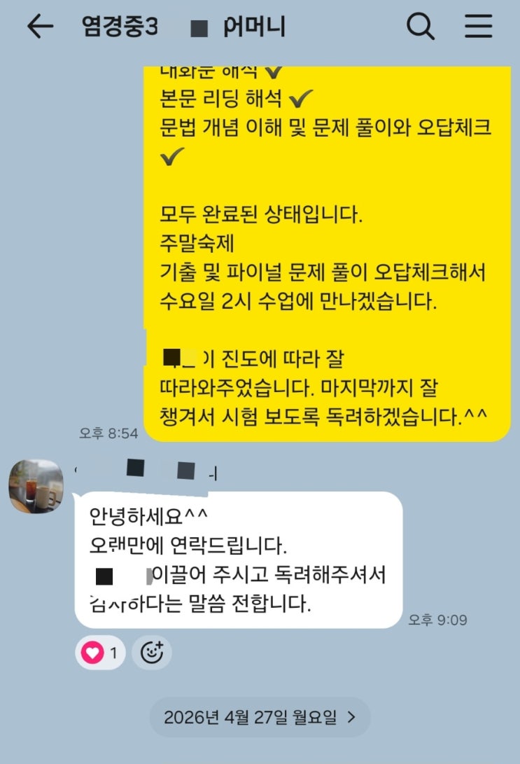 아이 영어학원을 보내면서 가장 많이 고민하시는 부분이 하나 있습니다. “우리 아이가 제대로 배우고 있는 걸까?” “수업은 잘 따라가고 있을까?” 결국 궁금한 건 단순한 성적보다 아이의 변화입니다. 학원을 운영하다 보면 가장 의미 있게 느껴지는 순간은 결과표가 아니라 학부모님의 한마디 피드백일 때가 많습니다. 실제로 이런 말씀을 자주 듣습니다. ✔ “꾸준히 잘하고 있는 모습이 보여서 대견해요.” ✔ “처음보다 많이 성장했다는 게 느껴져요.” ✔ “아이를 이끌어주셔서 감사합니다.” ✔ “집에서도 더 신경 쓰게 됐어요.” 이런 피드백의 공통점은 하나입니다. 단순히 “영어를 잘한다”가 아니라 아이의 태도와 흐름이 바뀌....... <img src="https://blogthumb.pstatic.net/MjAyNjA0MjhfMjE3/MDAxNzc3MzUzNDY1MDAw.OJQB19tsnoUZ8QwXCBXwtYPOxJiJo-TWNDHItwJOrdAg.URWimp87rV8BkgwkWvDcsPlllOpnkPV05zhs2_3KN7cg.JPEG/900_1777353462922.jpg?type=s3" />