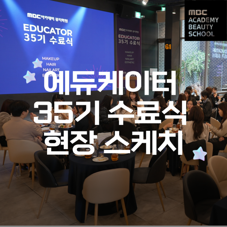 안녕하세요. MBC아카데미 뷰티학원입니다 지난주 MBC아카데미 뷰티학원에서는 특별한 행사가 진행되었는데요! 우리 학원의 미래를 이끌어갈 에듀케이터 35기 분들의 수료식이 열렸습니다. 이번 수료식은 강남캠퍼스 근처의 외부 행사장에서 진행되었는데요! 단순히 교육 과정을 마치는 자리가 아니라, 서로의 성장을 축하하고 새로운 출발을 응원하는 파티 같은 시간이었습니다! 열정 가득했던 그날의 현장 스케치를 전해드립니다. 에듀케이터 35기 수료식 현장 스케치 오전 발표 테스트를 마친 수료생들이 행사장으로 도착했습니다! 약 5개월간의 치열한 과정을 함께 보낸 동기들과 함께 입장하는 수료생분들의 표정에는 설....... <img src="https://blogthumb.pstatic.net/MjAyNjA0MjRfMTg0/MDAxNzc3MDA2OTc4MTA2.AVBFUMDV6zzMkgeYD8TmP5i8rHIzDjGElj-HHK9m7EQg._IL-i_3SCC1uyTlhpiglU3N46pxJC29luijW9kYG4fkg.PNG/%BA%ED%B7%CE%B1%D7%BD%E6%B3%D7%C0%CF-007.png?type=s3" />