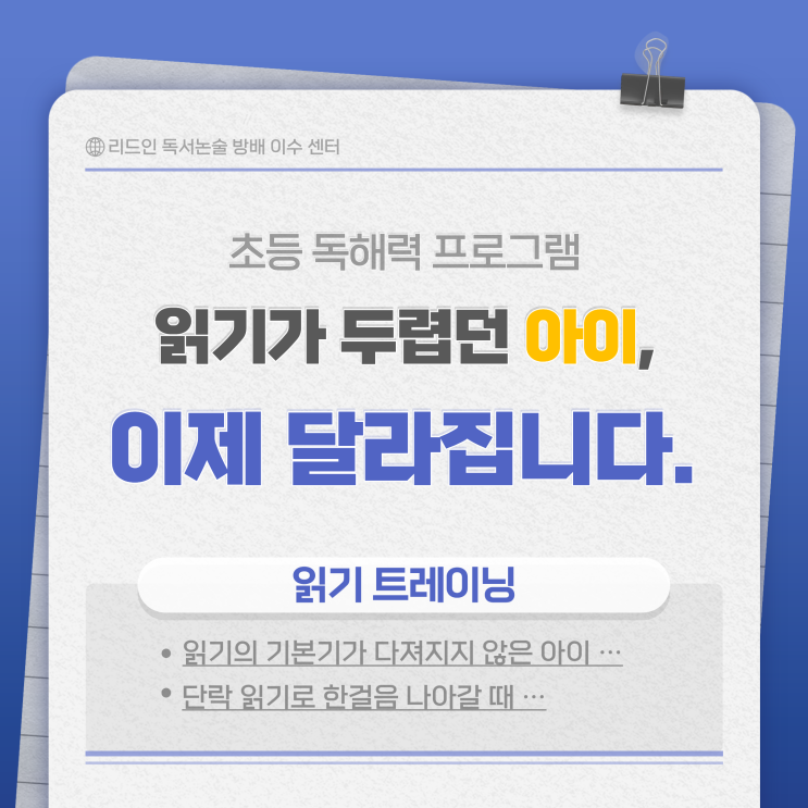 안녕하세요? 리드인방배이수센터입니다^^ 글이 빼곡한 교과서를 펼치는 순간, 읽기 기본기가 부족한 아이는 두려움을 느낍니다. 그림책에서 글밥책으로 넘어가는 이 결정적인 시기, 리드인 읽기 트레이닝이 그 다리가 되어 줍니다. 혹시 우리 아이, 이런 모습 있지 않나요? 책상에 앉혀 책을 읽게 했는데, 5분도 안 돼서 딴짓을 합니다. 분명히 다 읽었다고 하는데, 내용을 물어보면 "기억 안 나요"라고 합니다. 그림책은 잘 보던 아이가 글밥이 많아지자 책을 멀리하기 시작했습니다. 이런 모습, 아이가 게으르거나 독서 재능이 없어서가 아닙니다. 읽는 방법을 배운 적이 없어서입니다. 우리는 아이에게 걷는 법을 가르치듯, 수영하....... <img src="https://blogthumb.pstatic.net/MjAyNjA0MTJfMjQy/MDAxNzc2MDAwODg5MjA2.5cJ-IoGZ0Aqrarmzh2U1l5TQaWCuSh19KEoCeGMOV2og.TbrBPvg19YXckSKCfs_OuJt9pO_WrpiCDfDzi2IImAYg.PNG/1.png?type=s3" />
