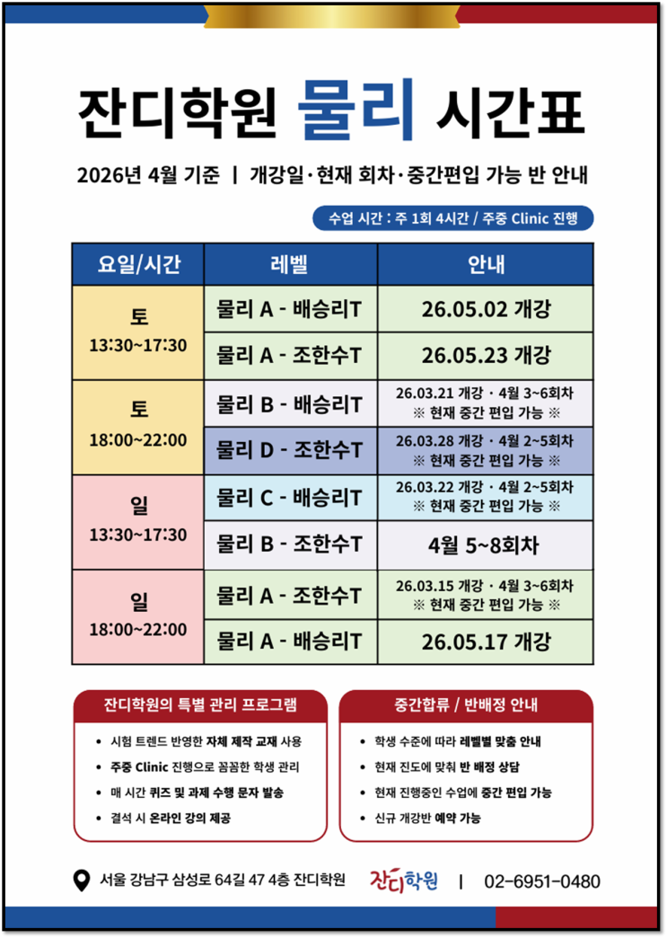 ★ 잔디학원 홈페이지 안내 의대, 명문대 진학을 위한 영재학교, 과학고 준비 진학 결정하기 전 확인해야 할 사항, 준비 방법, 학교별 정보까지, 관련 정보 총정리 잔디학원에서 도와드리겠습니다! 학원 연락처 조한수 원장 H.P. (010-9889-4080) 잔디학원 (02-6951-4080) 고등학교 물리학1/2 내신 개인 지도 ⇒ 개인 지도 진행 고등 학교 물리 내신, 잔디학원에서 해결해 드리겠습니다. (조한수 원장과 직접 상담 후 시간 결정) 전수업 공통 Clinic 진행 ⇒ 잔디팀의 모든 수업은 주중/주말에 전 주 수업한 내용에 대한 확인과 실력 다지기를 완성하는 Clinic을 진행하며, 전 수업에 대해 복습용 동영상을 무한 제공합니다. " 잔디학원은 학....... <img src="https://blogthumb.pstatic.net/MjAyNjA0MDVfMzUg/MDAxNzc1MzkyNTYyNzYy.Enaplk0tPScFL0jvRz5FJt34eud6ljnyY7ZJO6N900Ug.Dun1j-c3p7zo0Ti_R8Z1QtjwkU6cl0T-zGU7Lli8MAgg.PNG/image.png?type=s3" />