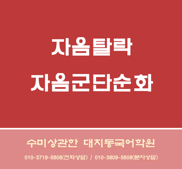 ㅎ탈락 & 자음군단순화 & 음절의 끝소리규칙 문제를 풀다보면 위의 3가지가 헷갈려서 자주 틀립니다. 문법을 배운지 1~2주때는 개념을 몰라서 풀지 못하거나 무슨 뜻인지 이해를 못하다가 3~4주차가 지나면 알기는 하는데 부분부분 이해를 했는지 정답률이 떨어질 때가 있습니다 예를 들어,겹받침 'ㄶ'은 ㅎ탈락도 될 수 있고, 자음군단순화도 될 수 있습니다. 겹받침 ㅄ ㄳ 등은 자음군단순화가 일어나는데 ㅂ,ㄱ으로 발음되는 것을 음절의 끝소리규칙이라고 하는 학생들이 더러 있습니다. 왜 그럴까요? 학생들은 이렇게 말합니다. "어려워요~" 저는 이렇게 대답합니다 "열심히 하면 금방 좋아져~" 그러....... <img src="https://blogthumb.pstatic.net/MjAyNjA0MTlfMTI4/MDAxNzc2NTY2Mjg4ODkx.FWl_7Wv7HBH4iuJZ7A5_vyLEEVBw9b-IcDjG1afvgL4g.sm_i5tSSVO6M8G0Kf3lD_mJIbBQRXIAGM-lyCe1meHgg.PNG/%BD%BA%C5%A9%B8%B0%BC%A6_2026-04-18_164439.png?type=s3" />