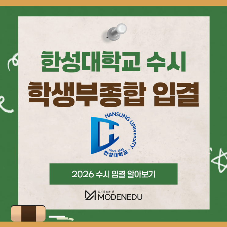 안녕하세요! 결과가 다른 입시의 시작 모든에듀케이션입니다. 2026학년도 입시가 끝나고 2027학년도 입시를 위해 많은 분들이 관심을 갖고 계실거라 예상됩니다. 힌트를 드리자면 그 중에서도 가장 먼저 시작과 마무리가 진행되는 수시 시즌은 벌써부터 많은 분들이 신경을 쓰고 계실 것 같은데요. 수시 전형 중에서도 지속적으로 변화가 발생한 학생부종합전형에 대해 알아보고자 합니다. 이번에 알아볼 정보는 한성대학교 수시 학생부종합전형 입결입니다! 수시 학생부종합전형의 전형 방법 및 특징 2024학년도 대입부터 자소서가 아예 폐지되며 수시에 반영되는 생활기록부 역시 매우 간소화되었습니다. 봉사활동이나 교내 수상경력 등 많은 요....... <img src="https://blogthumb.pstatic.net/MjAyNjA0MjJfNjkg/MDAxNzc2ODM1NjUwMTE0.X4jiWVINhk2oF6dpQUdiKSfOC8fMj4yRZlKljd9Q7SAg.lcHQyrKrOMko2BS2Tk_u2x48piYkR5q8XRv_W098lSgg.PNG/1.png?type=s3" />
