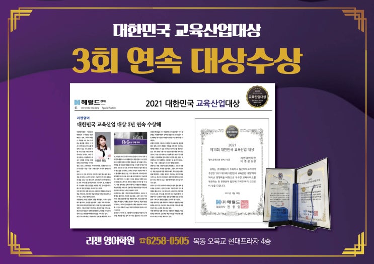안녕하세요, 목동 영어의 자부심 리젠영어학원입니다! 오늘은 저희 학원에 아주 뜻깊은 소식이 있어 전해드리고자 합니다. 리젠영어학원이 헤럴드경제 주최 <대한민국 교육산업대상>에서 무려 3회 연속 대상을 수상하는 쾌거를 이루었습니다! 왜 리젠영어인가? 세 번의 대상이 증명하는 가치 단순히 영어를 가르치는 곳은 많습니다. 하지만 교육의 질을 꾸준히 유지하며 대외적으로 인정받는 곳은 드뭅니다. 흔들리지 않는 교육 철학: 급변하는 입시 환경과 코로나19 등 어려운 상황 속에서도 리젠영어는 변함없는 학습 원칙을 고수해왔습니다. 온·오프라인 하이브리드 시스템: 대면 수업의 열정과 온라인 플랫폼의 효율성을 결합해, 어떤....... <img src="https://blogthumb.pstatic.net/MjAyNjA0MTFfMjIy/MDAxNzc1ODg2OTE0NjE5.z-p8wBZmvrFzBoS9sfvmwWekFFUfSrpUazyQapY7p5Qg.JTwLWxnxVHYZsrgJgow-RdS5l6ZGK6k51fcL6FrIYVMg.JPEG/260409_3%C8%B8_%BF%AC%BC%D3_%B4%EB%BB%F3_%BC%F6%BB%F3%28%B0%A1%B7%CE%29.jpg?type=s3" />