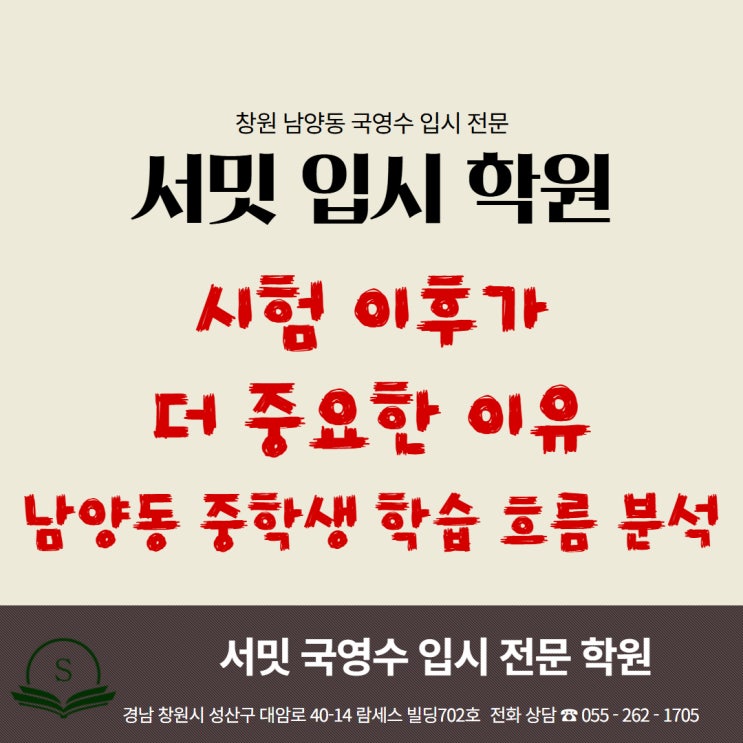 시험 이후가 더 중요한 이유 남양동 중학생 학습 흐름 분석 시험이 끝나면 공부를 멈추는 학생들이 많습니다. 특히 창원 성산구 남양동 지역의 사파중학교, 대방중학교, 안남중, 신월중 학생들을 지도하다 보면 공통적으로 나타나는 흐름이 있습니다. 시험 직전까지는 분명히 열심히 했는데, 시험이 끝나고 나면 갑자기 공부 흐름이 끊기는 이유는 무엇일까요? 단순히 “의지가 부족해서”로 설명하기에는 조금 더 구조적인 원인이 있습니다. 오늘은 시험 이후 공부가 멈추는 이유를 정확하게 짚어보겠습니다. 1. 시험이 끝나면 ‘목표 자체가 사라진다’ 학생들은 보통 시험을 목표로 공부합니다. 시험 범위 시험 날짜 점수라는 결과 이 세 가지....... <img src="https://blogthumb.pstatic.net/MjAyNjA0MjFfMTkw/MDAxNzc2NzQ5MTUzMDI3.E6nj4bYeRAAZAsQPzySFNPGeDwsalA9X_xprWwLwnXwg.kmnPszsasTs_1PKVmGzNINg-IAXqjUyyNuYLjxjjlWUg.JPEG/%BC%AD%B9%D4_%C1%DF%B5%EE%BA%CE_%B8%F0%C1%FD_%2890%29.jpg?type=s3" />