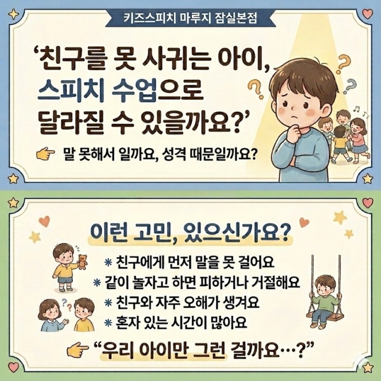 안녕하세요! 키즈스피치 마루지 잠실본점입니다 우리 아이가 유치원이나 학교에서 친구들과 잘 어울리지 못하고 겉도는 모습을 볼 때, 부모님들의 마음은 참 무겁고 미어지기 마련입니다. 우리 아이 성격이 너무 내성적인가? 사회성이 부족한 걸까? 고민하며 밤잠 설치시는 학부모님들을 위해 준비했습니다. 오늘은 “친구를 못 사귀는 아이, 스피치 수업으로 정말 달라질 수 있을까?”라는 주제로 이야기를 나눠보려고 합니다. 우리 아이, 이런 고민 있으신가요? 단순히 “시간이 지나면 괜찮아지겠지”라고 넘기기엔 아이의 학교생활이 걱정되는 포인트들이 있습니다. -친구에게 먼저 말을 거는 것을 힘들어해요. -친구가 “같이 놀자”고....... <img src="https://blogthumb.pstatic.net/MjAyNjA0MjNfMjQx/MDAxNzc2OTU0MjE2MzE5.Wf7QGQz8ng8pXcbkdN0ipBq5XppdjC2uBtHMjiLKXHsg.g6YqCOqTofnFomksCtX82QyPLF5QbMEsCSmM8rjccw0g.JPEG/IMG%A3%DF2787.JPG?type=s3" />