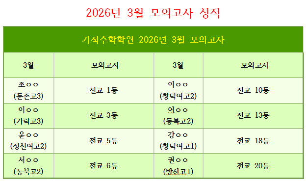 많은 친구들이 전교 50등 안에 들었는데 전교 20등 이하의 학생들만 기적수학학원 명예의 전당에 올립니다. 중간고사 끝나고 내신성적과 함께 5등급이 3등급이 된 학생이라던가 마저 올리도록 하겠습니다. <img src="https://blogthumb.pstatic.net/MjAyNjA0MjBfMjkx/MDAxNzc2Njg3ODg0NTI0.PvaX8ABGRqtB_AwVfa-QQK1DuPa6dmL5wJ3UQMwACdkg.XN8Q6i6nNrFoualesYGPvTviwnj4A2G-ch_lcYLWwSgg.PNG/image.png?type=s3" />