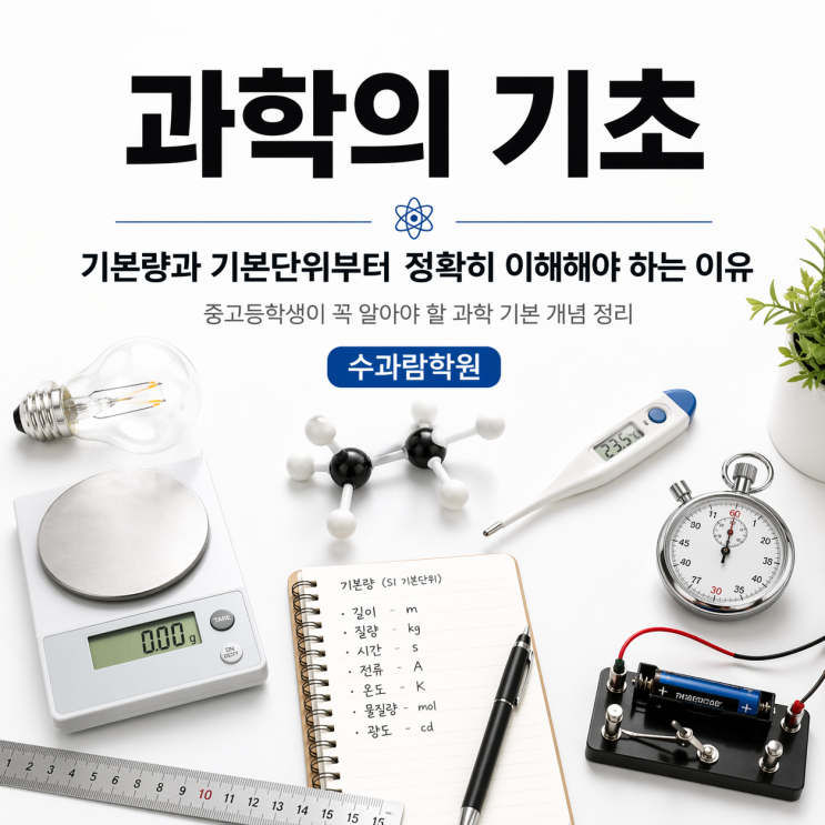 창원과학학원 과학의 기초 기본량과 기본단위부터 정확히 이해해야 하는 이유 중고등학생이 꼭 알아야 할 과학 기본 개념 정리 수과람학원 과학 공부를 시작하면 가장 먼저 만나게 되는 개념 중 하나가 바로 기본량과 단위입니다. 처음에는 단순히 외워야 하는 내용처럼 보이지만, 실제로는 물리·화학·지구과학을 이해하는 출발점이 됩니다. 특히 중학교 과학에서는 속력, 밀도, 힘, 압력 같은 개념을 배우기 시작하고, 고등학교에서는 물리량 사이의 관계를 식으로 다루는 일이 많아집니다. 이때 단위의 의미를 정확히 이해하지 못하면 공식은 외워도 문제를 제대로 풀기 어렵습니다. 오늘은 과학의 기초 중에서도 가장 중요한 기본량, 기본단위....... <img src="https://blogthumb.pstatic.net/MjAyNjA0MjNfMTgw/MDAxNzc2OTMwNDI0MTEy.WHEZeZ39HL1yJhNHZFWdQ310nQvTfbC_EnejEXC6QM0g.BcXe6c_UyH0h6kBXYBBOSODiG43PVHIe_wnrPhmzemEg.PNG/image.png?type=s3" />
