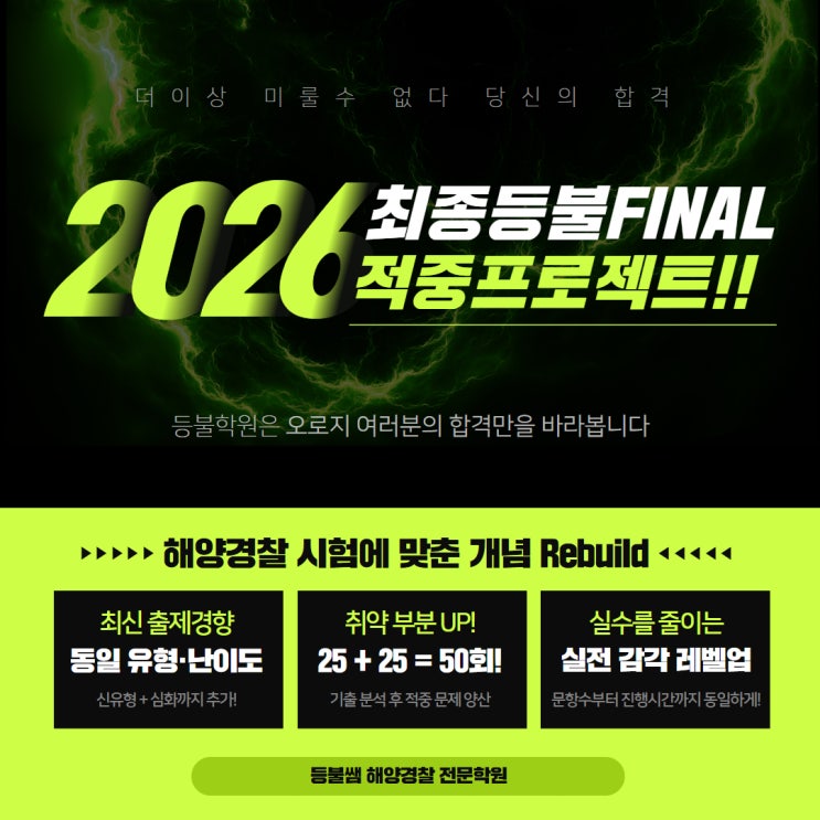 안녕하세요 :) 등불학원 해경쌤입니다. 상반기 채용 시험 과목인 해양경찰학개론, 형사법, 해사법규, 해사영어, 항해학, 기관학까지 방대하고 산더미 같은 양 속에서 마무리 전략을 고민하고 계신가요? 2026년 해양경찰 채용 시험을 확실하게 끝내줄 등불 파이널 과정이 드디어 시작됩니다! 왜 '등불 파이널'은 다를까요? 등불 파이널은 단순히 문제를 푸는 것에 그치지 않습니다. 최근 출제 경향 반영은 물론, 기출의 출제 의도를 정확히 파악하고, 시험장에서 어떤 변수에도 흔들리지 않는 객관적인 실전 감각을 만드는 데 집중합니다. 전국 최초의 해양경찰 전문학원 ! 전직 해양경찰 강사진 ! 진짜 전문가들의 독보적인 노하우가 집....... <img src="https://blogthumb.pstatic.net/MjAyNjA0MTNfMTYz/MDAxNzc2MDU3ODI3MDYy.gJlZLJSeVB0EenSZQkScVwg6efq1bQj-Z67adQnoR2cg.ZilzbS75XrN5PoazqzEbCSNFkXTRtrNCjj6FbkVRec8g.JPEG/26%B3%E2%28%BB%F3%29_%C6%C4%C0%CC%B3%CE_1.jpg?type=s3" />