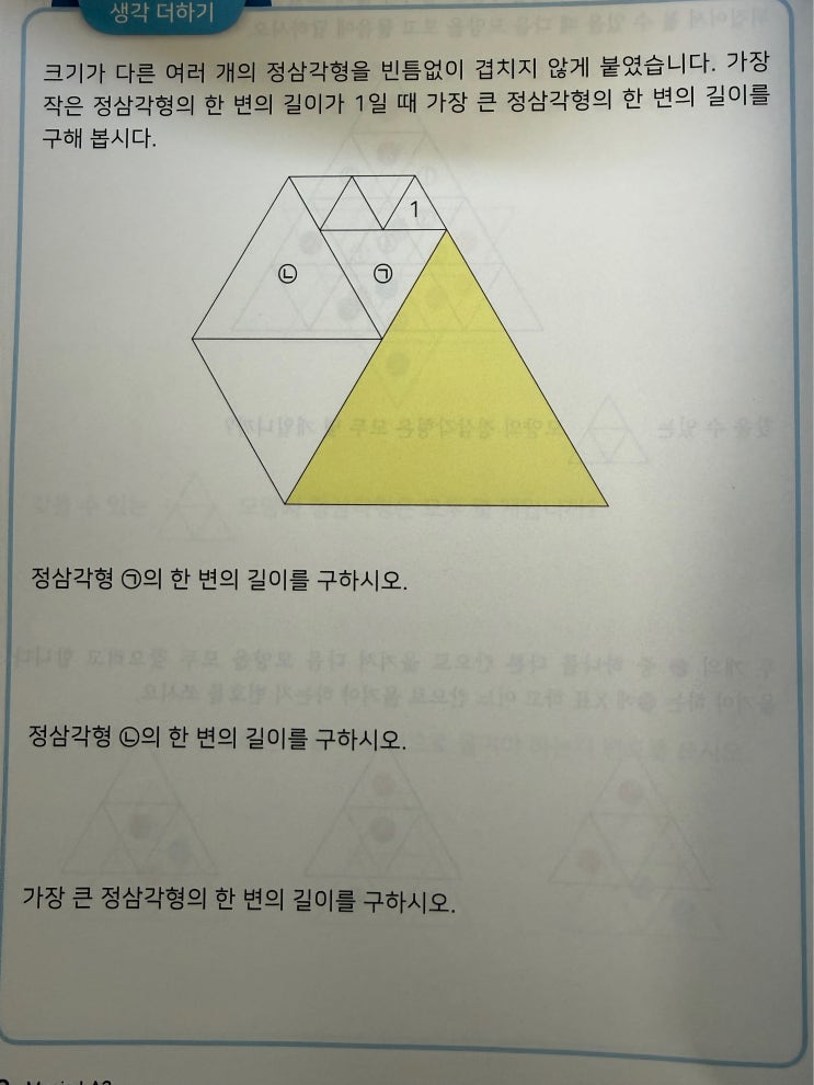 사고력 수학 + 교과 수학, 같이 해도 될까요? 정답은 ✔️ “함께 할 때 더 효과적입니다.” 사고력 수학은 ‘이해의 깊이’를, 교과 수학은 ‘정확성과 문제 해결력’을 만들어줍니다. 한 가지만 하면 생기는 한계, 두 가지를 균형 있게 하면 자연스럽게 채워집니다. ✔ 저학년: 사고력 중심 + 교과 가볍게 ✔ 학년 상승: 교과 비중 점점 확대 중요한 건 양이 아니라 ‘균형’입니다. 수학은 속도가 아니라 방향입니다. 지금, 아이에게 맞는 균형을 만들어 주세요. 예를들어 사고력에서 도형을 배워놓으면 교과수학에서 잘 활용할수 있어요 사고력 도형문제의 핵심은 작은 정삼각형(변=1)이 어떻게 큰 삼각형을 채우는지 아는것 교....... <img src="https://blogthumb.pstatic.net/MjAyNjA0MTZfNzEg/MDAxNzc2MzE0NTAyMjk5.cruwY7IoReADFRP4cYvf3DqD3roxHTj-ELyOMs7hFDUg.YgekS_L5Tg7yHAiGJ8WMVuVFUDR6j6u4dRbHMq4LKoQg.JPEG/%B8%C5%C1%F7%B5%B5%C7%FC.jpg?type=s3" />