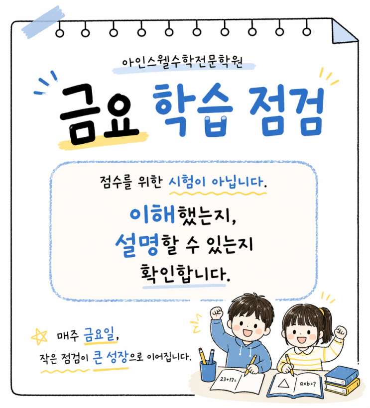 아인스웰수학전문학원은 매주 금요일, 아이의 학습을 ‘평가’하기보다*‘이해하고 점검하는 시간’*을 운영합니다. 이 시간은 점수를 확인하는 시험이 아니라 아이의 학습 상태를 세밀하게 읽어내는 과정입니다. 아인스웰은 다르게 봅니다 많은 학습은 “맞았다 / 틀렸다”로 끝납니다. 하지만 아인스웰은 그보다 중요한 것을 봅니다. ✔ 왜 맞았는지 ✔ 왜 틀렸는지 ✔ 무엇을 제대로 이해하지 못했는지 아이의 결과가 아니라 **아이의 ‘생각 과정’**을 중심으로 지도합니다. 금요 점검의 핵심 이 점검은 단순한 테스트가 아닙니다. ✔ 개념이 제대로 연결되어 있는지 ✔ 문제를 읽고 이해하는 힘이 있는지 ✔ 끝까지 집중하는 태도를 가....... <img src="https://blogthumb.pstatic.net/MjAyNjA0MTFfMjQy/MDAxNzc1OTEzNDMxMzg4.Pw6hss-_4QSxxYLiavYW1NOgur871q5sSzJzQq9BNE4g.89re6emVPZuU4b4z_K0gNVNwe5okcF8N05I6DkBI3E0g.PNG/900_file_0000000073307206b54fd01e2c20bd01.png?type=s3" />