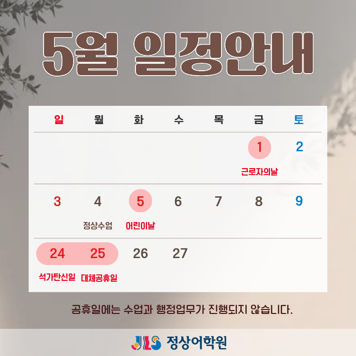 안녕하세요, 학부모님. 정상어학원입니다 ^^ 5월 가정의 달을 맞아 정상어학원 5월 일정 안내드립니다. 5월 일정 > 5월 1일(금) 노동절 > 5월 5일(화) 어린이날 > 5월 25일(월) 대체공휴일 ※5월 4일(월)은 정상 수업합니다. 다가오는 가정의 달을 맞아 가정에 늘 행복과 건강이 가득하시길 바랍니다! 감사합니다 ^^ <img src="https://blogthumb.pstatic.net/MjAyNjA0MTVfMjgx/MDAxNzc2MjQ3ODUwMDQ4.4zeFw00ySaxJmUw2EPY8r6S5nuivrDDk4XfXkA5_vrUg.NUEZOlH2RBl_iZetOY_eLRPtDjRCMVyvwOQB85m1gI0g.PNG/%C1%A6%B8%F1%C0%BB_%C0%D4%B7%C2%C7%D8%C1%D6%BC%BC%BF%E4..png?type=s3" />