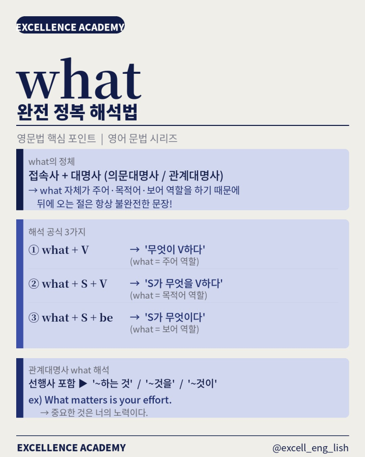 영어 문장에서 what이 나오면 당황하는 학생들이 많아요. 오늘은 딱 3가지 공식으로 정리해드릴게요. ✅ 핵심 포인트 what 뒤에는 항상 불완전한 문장이 와요. 이유는 간단해요. what 자체가 주어·목적어·보어 역할을 하기 때문이에요. ✅ 해석 공식 3가지 ① what + V → "무엇이 V하다" (what = 주어) ② what + S + V → "S가 무엇을 V하다" (what = 목적어) ③ what + S + be → "S가 무엇이다" (what = 보어) ✅ 관계대명사 what 선행사를 포함하고 있어서 "~하는 것"으로 해석해요. 예) What matters is your effort. → 중요한 것은 너의 노력이다. 수능·내신에서 매년 출제되는....... <img src="https://blogthumb.pstatic.net/MjAyNjA0MjRfMjI3/MDAxNzc3MDIxODIzNTc0.t13szLMci1iu8Z3pNdU9txwKPYzyQfFTMzXmDJ-v5Sgg.x81j919w9unaVZN-zOx5FDEZvV2YQHpb9n7vGYpgT4kg.PNG/what_card1_%C7%A5%C1%F6_%BC%F6%C1%A4.png?type=s3" />