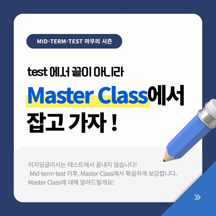 “마지막을 향해가는 이지잉글리시의 Mid-term-test 시즌” 시험이 끝나면 잠시 숨을 고르게 되지만, 영어 학습은 이 시기 이후를 어떻게 이어가느냐가 중요하죠. 이지잉글리시는 테스트에서 끝나는 학습이 아니라 그 이후까지 이어지는 흐름을 중요하게 생각해요. 이지잉글리시에서는 시험 이후의 학습 흐름까지 이어가기 위해 Master Class 제도를 운영하고 있으며, 오늘은 그 내용에 대해 간단히 소개해보려 합니다 “이지잉글리시만의 Master Class” 이지잉글리시 Master Class란 Master Class는 단순히 부족한 부분을 반복하는 보강 수업이 아니라, 학생마다 다른 학습 상태와 흐름을 고려해 필요한 부분을 정확하게 짚어주는 맞춤형 학....... <img src="https://blogthumb.pstatic.net/MjAyNjA0MjNfMyAg/MDAxNzc2ODk5NjM2NjQ2.kqSp36iXkCn_T4LvMOYSDuOWZnp1mjAeYbxyBEVz4PIg.J9vN5qa0LblTauDXrxlWoH8wolowzq1OR2Fkg4yHOCog.JPEG/260422_Master_Class%BC%D2%B0%B3%C4%DC%C5%D9%C3%F7_01.jpg?type=s3" />