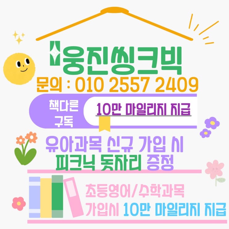 요즘 우리 아이 교육, 어떻게 시작해야 할지 고민 많으시죠? 학습도 중요하지만 무엇보다 꾸준한 독서 습관이 아이의 성장에 큰 영향을 준다는 사실, 다들 알고 계실 거예요 그래서 오늘은 많은 학부모님들 사이에서 인기 있는 웅진씽크빅의 특별한 혜택을 소개해드리려고 합니다! 지금 가입하면 이런 혜택이! ✔ 책다른 구독 시 10만 마일리지 지급! ✔ 유아 과목 신규 가입 시 피크닉 돗자리 증정! (아이와 함께하는 야외 활동까지 ) ✔ 초등 영어 / 수학 과목 가입 시 10만 마일리지 추가 지급! 왜 웅진씽크빅일까요? 아이 눈높이에 맞춘 맞춤형 학습 콘텐츠 독서를 습관으로 만들어주는 체계적인 커리큘럼....... <img src="https://blogthumb.pstatic.net/MjAyNjA0MjlfMTgx/MDAxNzc3NDcyNDI2NTU3.Yo4H5LhfI3R8YzL1R-OMSpolYvfUItecj5ZSxXuv-pcg.qG2jiCP0e8WKYyWI8KB8ihXeaIa_y8sv_7YlsiofWAgg.JPEG/1.jpg?type=s3" />