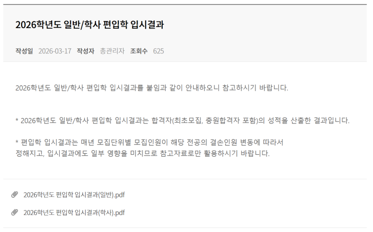 [경남대학교 2026학년도 일반 학사 편입학 입시결과(2026.03.17) / 출처: 경남대학교 입학처 홈페이지 /정리: 로스트럼 Y 학원]