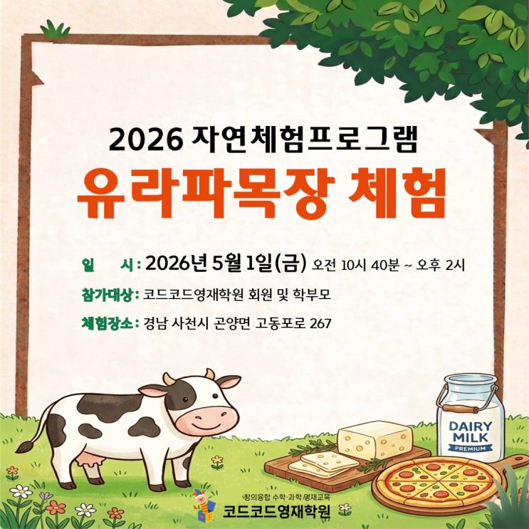 안녕하세요, 코드코드영재학원입니다. 우리 아이들이 교실을 벗어나 자연 속에서 생명의 소중함을 배우고, 오감을 통해 과학적 호기심을 채울 수 있는 "유라파목장 자연체험프로그램"을 준비했습니다! 드넓은 초지에서 동물들과 교감하며 특별한 추억을 만들 이번 체험에 많은 관심과 참여 바랍니다. 교실 밖에서 만나는 생생한 과학, 자연이라는 거대한 실험실로 떠납니다! 푸른 풀 내음 가득한 유라파목장에서 아이들의 감성을 깨워주세요^^ 운영시간 : 화요일-금요일 14:00~19:00 토요일 10:00~15:00 일요일, 공휴일 휴무 전화번호 : 051-361-7979 학원주소 : 부산 북구 금곡대로285번길 19 리버사이드빌딩 503호 <img src="https://blogthumb.pstatic.net/MjAyNjA0MjFfMTA1/MDAxNzc2Nzc5MDY4OTIz.b4xajyGO0XOB5kmCamsr_eiuitsnkliyQN_uNYTBIbMg.aiwurpcmENTtL2meG349td5u4zO84HgZhhZzwG4Qq44g.JPEG/2026_%C0%AF%B6%F3%C6%C4%B8%F1%C0%E5_%C3%BC%C7%E82.jpg?type=s3" />