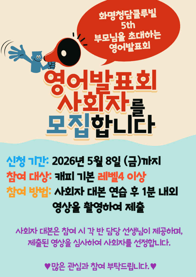 안녕하세요, 화명청담클루빌어학원입니다. 올해 발표회가 7월에 곧 시작됩니다!! 이번에는 사회자를 오디션을 통해 선발할 예정입니다. 우리 청클 학생들의 많은 관심과 적극적인 참여를 기다립니다! 상담전화 051-363-6222 상담예약 https://naver.me/5DZK1Ebw <img src="https://blogthumb.pstatic.net/MjAyNjA0MjFfNDcg/MDAxNzc2NzYyOTI0Njc0.D9eDNq0HndM66S_rCiG4QtsoRv9iQbbAx3PwcEyMr4Ug.PuiUFHyo2PF8hdOYm78VcYvxR-DnUOJfLUE9CZyy2OMg.PNG/%C1%A6%B8%F1%C0%BB_%C0%D4%B7%C2%C7%D8%C1%D6%BC%BC%BF%E4._%2811%29.png?type=s3" />