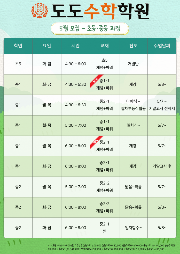 안녕하세요, 도도수학학원입니다! 1학기 중간고사를 치르느라 우리 학생들 정말 고생 많았습니다. 시험이 끝나고 마음이 들뜨기 쉬운 5월이지만, 사실 이때가 기말고사 성적을 결정짓는 가장 중요한 골든타임입니다. 도도수학학원에서는 중간고사 분석을 마치고, 5월부터 새롭게 시작할 초등·중등·고등 과정 신규 수강생을 모집합니다. 초등·중등 과정 : 탄탄한 기초부터 응용까지 초등부와 중등부는 학생의 학습 속도와 목표에 맞춘 맞춤형 반이 준비되어 있습니다. 초등 5학년 과정은 화요일과 금요일(4:30~6:00)에 개별반으로 운영됩니다. '초5 개념+파워' 교재를 통해 아이들 개개인의 수준에 맞춰 꼼꼼하게 지도합니다....... <img src="https://blogthumb.pstatic.net/MjAyNjA0MjhfMTc4/MDAxNzc3MzU0MTY3Mjg1.8y4JpxouGNytFYLf_eO9RHAuGPGGDzFIyGjEuKKJOfsg.LqANRlurPl_U-5W8vCxnppQ1ZCBq9eAzsdM-SBJgSLsg.PNG/%C1%A6%B8%F1%C0%BB_%C0%D4%B7%C2%C7%D8%C1%D6%BC%BC%BF%E4..png?type=s3" />
