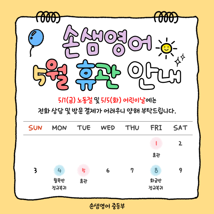 안녕하세요, 중2 전문관입니다. 5월 휴관 안내드립니다. 5/1(금) 노동절 및 5/5(화) 어린이날은 공휴일로 전화 상담 및 방문 결제가 어려우니 양해 부탁드립니다. 감사합니다. :) ※ 정규 수업 복귀일 ※ 5/4(월) : 월목반 정규 수업 복귀일 5/8(금) : 화금반 정규 수업 복귀일 <img src="https://blogthumb.pstatic.net/MjAyNjA0MjlfMTk3/MDAxNzc3NDQ5MDk5MDQ5.hZecv8FiUtB0X2uqMnoE5Ska4J3KdMnVcOGCT4edxbcg.Fbg-y5f7p63ltwAClF28Oddb7Dyu8KAxZw8jEr5oVC8g.PNG/%B0%F8%C8%DE%C0%CF_%BE%C8%B3%BB.png?type=s3" />