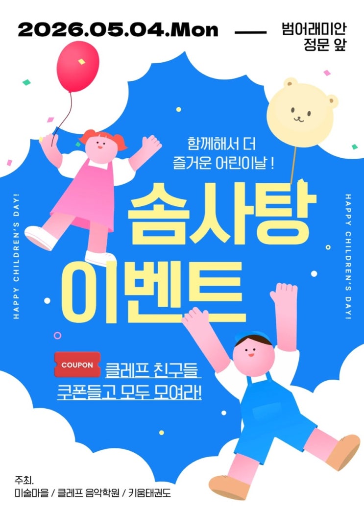 가정의 달을 맞이하는 따뜻한 5월, 우리 클레프 친구들을 위해 특별함 어린이날 이벤트를 준비했어요 미술마을 / 키움태권도장과 함께 5월 4일 월요일 오후 12시30분 - 4시30분까지 범어래미안 아파트 정문 앞에서 솜사탕을 나눠주는 이벤트를 준비했답니다! 이번주부터 클레프 친구들에게 교환권 쿠폰을 나눠주고있어요! 모두들 월요일을 기대해주세요! 함께해서 더 즐거운 어린이날! 솜사탕과 함께 달콤한 5월을 시작해보아요 클레프 음악학원 대구시 수성구 상록로 67-1 범어래미안 정문 옆 상가 2층 [동천초 도보2분] 문의. 010-7711-2092 <img src="https://blogthumb.pstatic.net/MjAyNjA0MjlfMjA4/MDAxNzc3NDYwMDAwNzcy.1tpqvoEVXIIPfY9WttTLB96qCes2K_jS5_pntxX0alQg.-bjEpWjUVaOQaypKHYnqfFHlPY1ykALIsm9LuAGHs3sg.JPEG/IMG%A3%DF2759.JPG?type=s3" />