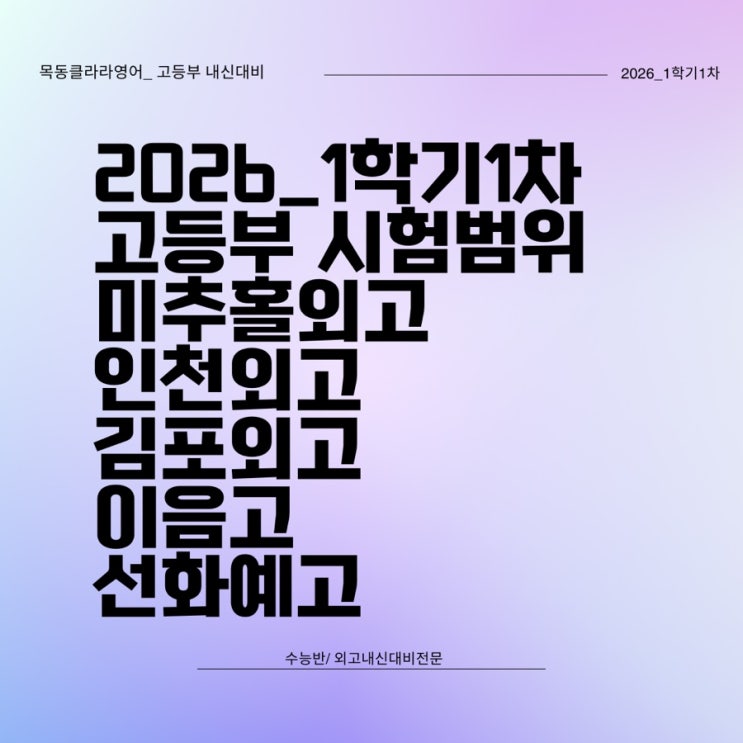 목동클라라영어학원의 고등부 내신 최종범위 올해는 김포외고 미추홀외고 인천외고 선화예고 이음고 학생들과 함께 멋진결과 만들어 보겠습니다! <img src="https://blogthumb.pstatic.net/MjAyNjA0MTBfMzAg/MDAxNzc1ODE4MTUzMTYy.sGnRDoik-boFLD8U_OtZa3a7jltbEA3ntRbA1sUlH5Qg.EkqUmSBPSQ_e0VdCjWrMDIoRvEC5Odwnd6dVSYz1FjAg.JPEG/IMG%A3%DF4322.jpg?type=s3" />