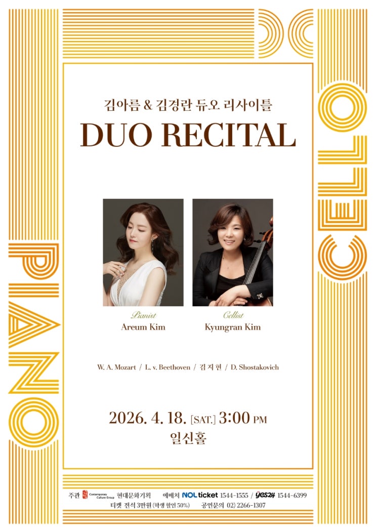 피아니스트 김아름 첼리스트 김경란 듀오 리사이틀 2026.04.18 일신홀 모차르트에서 베토벤 쇼스타코비치에 이어 한국 작곡가 김지현 선생님의 작품까지 다채로운 음악이 소개될 듀오 콘서트를 기대해주세요^^ <img src="https://blogthumb.pstatic.net/MjAyNjA0MTNfMTY2/MDAxNzc2MDc1Nzg4MTY5.aMaehvRY3yivctSB30S0rcYzAPa60_9GpGFFkoN1ankg._QRsILJJBV3f406zUG-2t2yEVz7wMzHUFpCpIk4S7Hsg.JPEG/900_1775718390568.jpg?type=s3" />