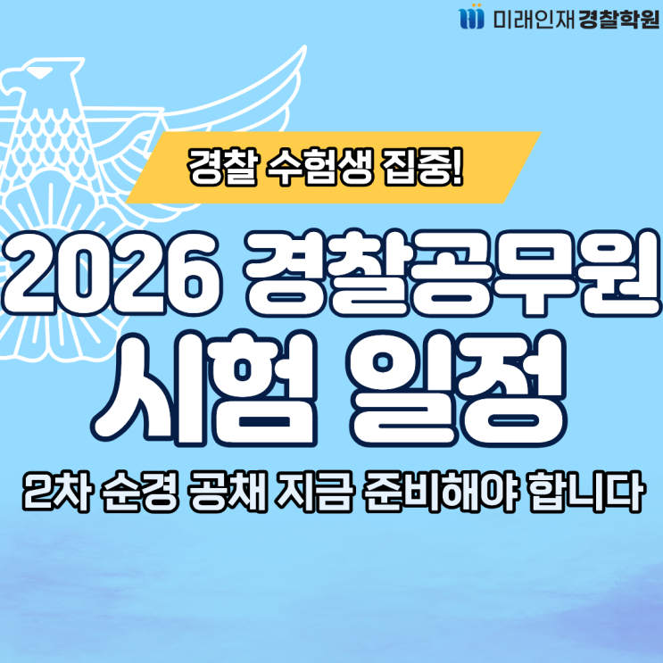 안녕하세요. 미래인재경찰학원입니다. 2026년 2차 순경 공채, 지금 준비 방향 잡으셨나요? 시험까지 약 4개월, 이 시기에 방향을 잘못 잡으면 합격이 어려워질 수 있습니다. ✅ 시험 일정 ✅ 응시 자격 ✅ 검정시험 기준 ✅ 필기 준비 전략 지금 꼭 알아야 할 핵심을 알아봅시다! 2026년 2차 순경 공채 시험 일정 ✅ 필기시험 2026년 8월 22일 (토) ✅ 최종 합격 발표 2026년 12월 11일 (금) 핵심 포인트 지금 기준 약 4개월 = 합격을 뒤집을 수 있는 기간 경찰공무원 응시 자격 ✅ 연령 만 18세 ~ 40세 ✅ 운전면허 제1종 보통 이상 필수 (최종시험일까지 유효) ✅ 신체 조건 경찰....... <img src="https://blogthumb.pstatic.net/MjAyNjA0MjBfMzEg/MDAxNzc2NjYwNTI1MjM2.k41y99apx-mhixdAcW0XccDfEaGLPGpB-Ptgwi8C8Qgg.vkwOOZBW3oi7n88M28OigXswVSiQkbFxiKTSjZ4FQqYg.PNG/%BA%ED%B7%CE%B1%D7%BF%EB_%BD%E6%B3%D7%C0%CF%281_1%29_%2820%29.png?type=s3" />