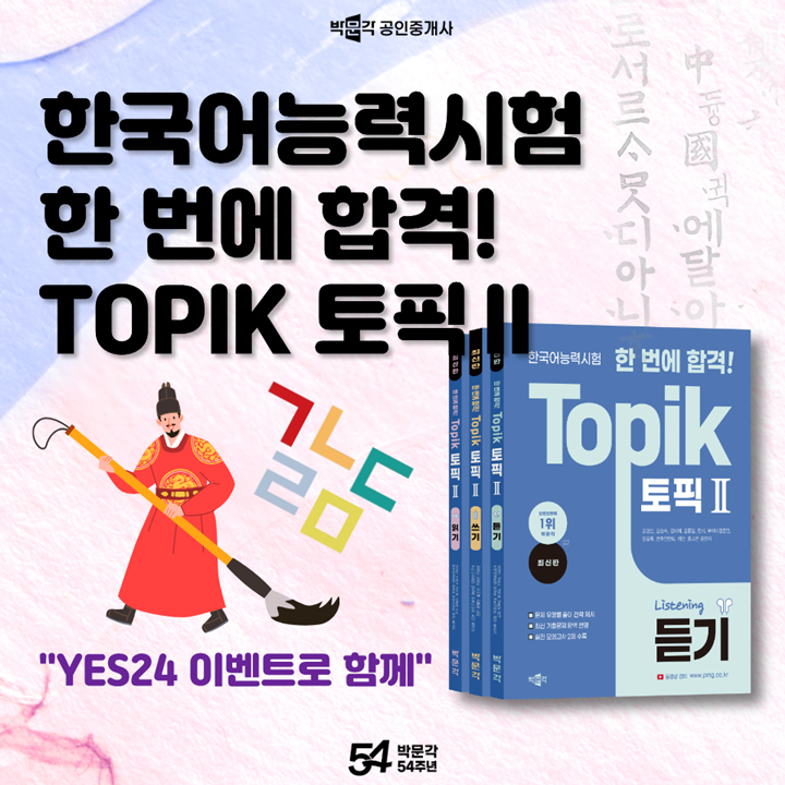 안녕하세요. 도전으로 함께하는 이름 한국어능력시험 TOPIK(Test of Proficiency in Korean)도 박문각이 함께 합니다. 한국어능력시험 한 번에 합격! TOPIK 토픽Ⅱ (듣기/쓰기/읽기) yes24 박문각의 한국어능력시험 TopikⅡ 합격응원 이벤트 EVENT.1 빠르게 완성하는 TOPIK! 박문각이 여러분을 응원합니다. 키보드에 부착하시고 한글로 자유롭게 타이핑하는 “한글 키보드 자판 스티커” *사은품 선택 시 포인트(마일리지) 차감되며 한정 수량으로 소진 시 이벤트 종료됩니다. EVENT.2 박문각 토픽 교재에 리뷰를 남겨주세요! 추첨을 통해 10분께 스타벅스 아이스 아메리카노 선물을 드립니다! 이벤트 기간: 2026.04.14.~05.10. 당첨자 발표: 202....... <img src="https://blogthumb.pstatic.net/MjAyNjA0MjFfMjA1/MDAxNzc2NzU2NTc2NjAz.PXMy05uSzKdL2YlS7FdmWQKXZWkEm9UnM8kno7hXiLQg.IdnBH12TKsTzzXlGhuh4HgPKt8_k_CJRh5QtO5dmD00g.PNG/258.png?type=s3" />