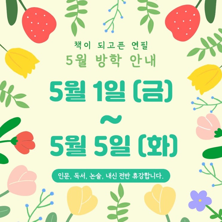 학교재량 휴업일에 맞춰 잠시 쉬어갑니다. 예쁜 아이들과 띠뜻하고 행복한 봄 만끽하시길 바랍니다. <img src="https://blogthumb.pstatic.net/MjAyNjA0MTFfMjk0/MDAxNzc1OTEyNjMyNDc1.DXKdMJS-1NRXkI8wOe9XjHncGIOq6yGHYqXP-VcOmvwg.FeN0_x-wDfwr01z3cPPbQikRGPaITMYxJ_aLxguVR6Qg.JPEG/1775912456017.jpg?type=s3" />