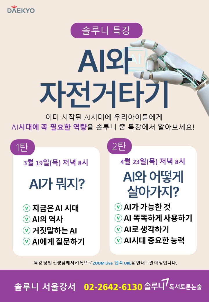 지난 달에 이어 인공지능 두 번째 특강입니다.^^ 우리 아이들에게 꼭 필요한 역량은 무엇일까? 아이들 뿐만 아니라 이 시대를 살아가는 모든 분들에게 필요한 AI 가족과 함께 들어보시기를 강력 추천드립니다.^^ #솔루니특강 #솔루니논리적글쓰기 #솔루니중등내신 #솔루니AI글쓰기평가 #솔루니수행평가 #솔루니신대방논술교습소 #솔루니중등교과수행평가 #솔루니한국사 #솔루니디베이트 <img src="https://blogthumb.pstatic.net/MjAyNjA0MThfMjgg/MDAxNzc2NDc0ODM5NTkz.MIm4V9lPkXvrp6FPED5k6nTYXMVzM09d0YIXoxtFAo0g.8ml7lOV0e1Rf33bc010-cP0rC-Jpn6AByeXg0b0McMsg.JPEG/1776474755438.jpg?type=s3" />