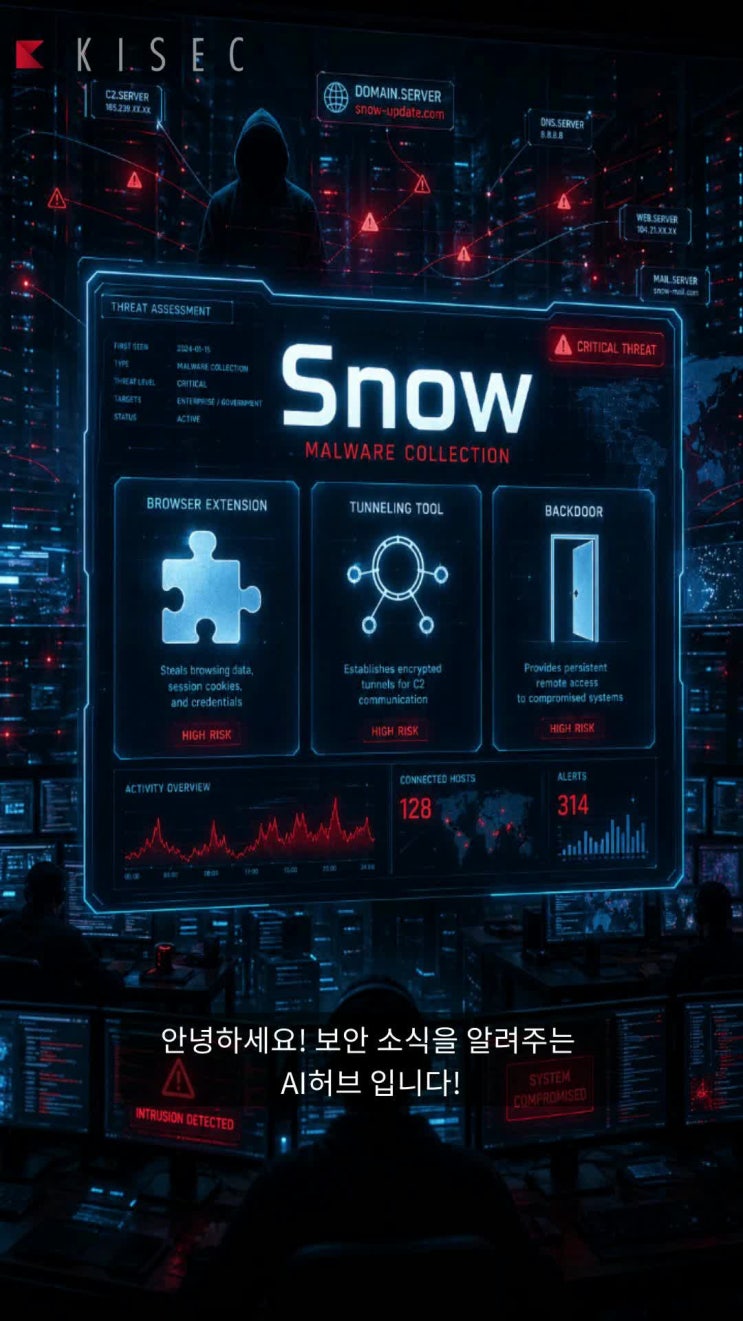 UNC6692라는 위협 그룹은 소셜 엔지니어링 기법을 활용하여 'Snow'라는 맞춤형 악성코드 스위트를 배포하고 있습니다. 이 스위트는 브라우저 확장, 터널러, 백도어로 구성되어 있으며, 목표는 자격 증명 탈취와 도메인 장악을 통해 민감한 데이터를 훔치는 것입니다. 공격자는 '이메일 폭탄' 전술을 사용하여 긴급성을 조성하고, Microsoft Teams를 통해 IT 헬프데스크 직원으로 가장하여 피해자에게 접근합니다. 피해자는 이메일 스팸 차단 패치를 설치하라는 링크를 클릭하도록 유도되며, 실제로는 'SnowBelt'라는 악성 Chrome 확장 프로그램이 설치됩니다. 이 확장은 Microsoft Edge 인스턴스에서 실행되어 피....... <img src="https://phinf.pstatic.net/image.nmv/blog_2026_04_27_14/qjNlS35M0Q_01.jpg?type=f480x480" />