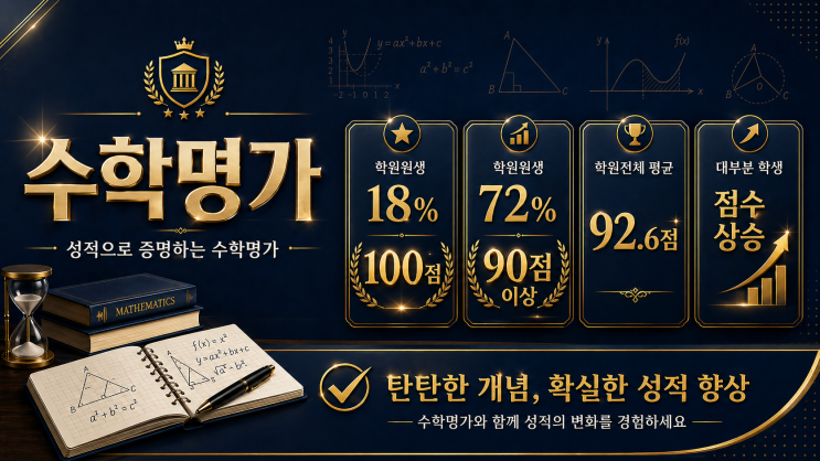 안녕하세요. 수학명가입니다. 중3 학생들의 첫 시험이 마무리되었습니다. 이번 시험을 준비하는 과정에서 학생들마다 어려움도 있었고, 힘든 순간도 있었을 것입니다. 하지만 그 과정 속에서 스스로 부족한 부분을 확인하고, 끝까지 해내는 경험을 쌓으며 분명한 성장도 함께 있었으리라 생각합니다. 수학명가에서도 중3 학생들과 함께 첫 시험 대비를 진행하며 많은 순간을 함께했습니다. 그리고 감사하게도 시험 이후 학생들이 좋은 소식을 많이 전해주고 있습니다. 현재까지 점수를 추산한 결과, 중3 평균 92.6점 학원 중3 원생 18% 100점 학원 중3 원생 72% 90점이상 수학명가 중3 원생 평균은 92.6점으로 매우 우수한 결과를 보여주었습니다....... <img src="https://blogthumb.pstatic.net/MjAyNjA0MzBfMTYx/MDAxNzc3NTMxMTE0ODAz.ByeQ3wQfv3yxMc4VyKxl3EX1PKHY5-h4bjplZjJZ2BEg.GtBIAcpCzVRnh_jofT5ZsTp_p9B3LiNuvk7ycUIbsIAg.PNG/ChatGPT_Image_2026%B3%E2_4%BF%F9_30%C0%CF_%BF%C0%C8%C4_03_38_20.png?type=s3" />