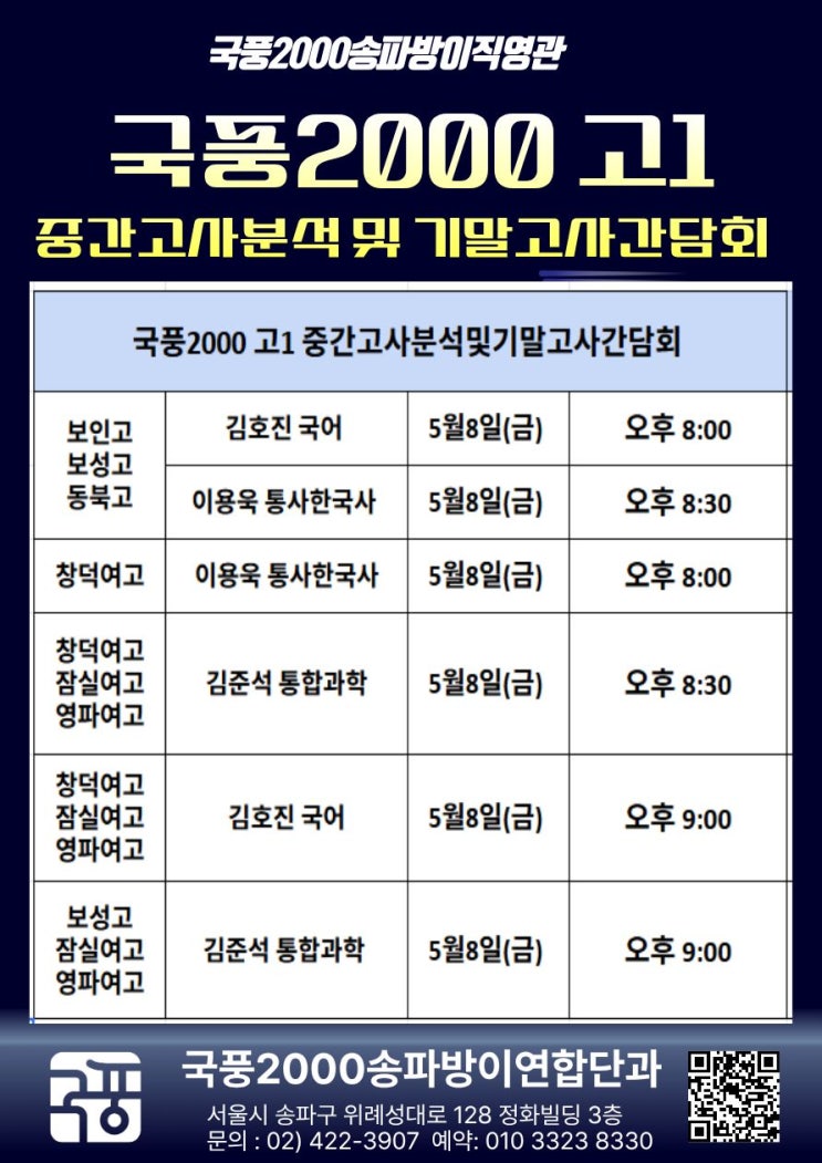 중간고사 결과를 바탕으로 보다 체계적인 기말고사 준비가 필요합니다. - 일정: 2026년 5월8일(금요일) - 시간: 오후8시 - 대상: 보인고 보성고 동북고 창덕여고 · 잠실여고 · 영파여고 - 장소 : 국풍2000송파방이직영관 3층 국풍2000 강사들의 적중력으로 고득점을 받은 재학생들의 사례와 함께 학교별 출제 경향 분석 과목별 학습 전략 안내 실질적인 성적 향상 방법 제시등을 객관적인 분석과 검증된 전략으로 기말고사를 준비하시기 바랍니다. 동북고1국어 https://blog.naver.com/knp2000sp/224269604363 보성고1 https://blog.naver.com/knp2000sp/224269373729 문의:02)422-3907 예약: 010 3323 8330 국풍2000송파방이직영관 정화빌딩3층....... <img src="https://blogthumb.pstatic.net/MjAyNjA0MzBfODMg/MDAxNzc3NTU1MDgwNTI0.383xpbtr3g-8kjGN_UXcdxRD7pT3hk0I7Ov2UGhygekg.sn-JkTdPSxpQ2dkCKneweAgbmpCzOodLtQXJwif6o8sg.JPEG/RKSEKSGHLRKSEKAGHL9999999999999999999999999999999999999999999999.jpg?type=s3" />