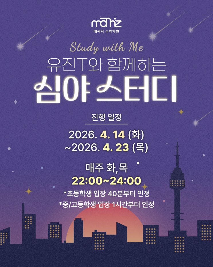 안녕하세요, 매씨지수학학원입니다 시험기간 늦은 밤이 되면 공부를 해야 한다는 마음은 있지만, 막상 혼자 책상 앞에 앉아 집중하기 어려운 학생들이 많습니다. 해야 할 일은 많은데 자꾸 미뤄지고, 휴대폰이나 주변 환경에 흔들리며 시간이 지나가기도 합니다. 이런 고민을 가진 학생들을 위 매씨지수학학원의 심야스터디가 내신대비 기간동안 진행되었습니다. 심야스터디는 집에서도 규칙적인 학습 습관을 만들 수 있도록 ZOOM 실시간 참여 방식으로 운영됩니다. 같은 시간에 함께 접속해 공부하는 것만으로도 자연스럽게 긴장감이 생기고, 흐트러졌던 공부 리듬을 다시 잡는 데 큰 도움이 됩니다. 혼자 공부할 때보다 시작이 쉬워지고, 끝....... <img src="https://blogthumb.pstatic.net/MjAyNjA0MjhfMjI0/MDAxNzc3MzU0NDI0Mjkw.D9YPgRCsEBcVOyDKrS2ad0SVLDKcFUKpnyA8br_O3ygg.Gs2ZIXa-NFcxuczgIk1-69GLxF3fNq0OAEuLsXo7_44g.JPEG/1.jpg?type=s3" />