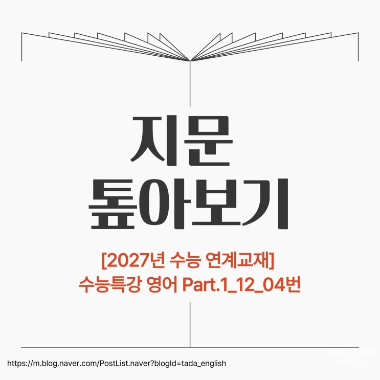 안녕하세요, 로제타스톤 영어교습소 화명 용수초 캠퍼스입니다^^ 지문 톺아보기 이번 지문은 2027년 수능특강 영어 12강 4번 지문입니다^^ 이 포스팅은 단순히 영어 지문을 해석하거나 문제를 푸는 데서 끝나지 않아요. 학생들이 직접 보고, 스스로 이해할 수 있도록 시각 자료와 실제 생활 속 상황을 연결해 만든 콘텐츠예요. 문장 하나, 그림 하나도 “이걸 보면 아이들이 조금 더 쉽게 이해하겠지?” 하는 마음으로 준비했답니다. 정확한 영어 해석은 이미 해설지에 잘 정리되어 있으니, 이곳에서는 내용을 쉽고 친절하게 풀어서 설명하며, 진짜로 이해하는 데 초점을 맞춰볼게요. 그럼 지금부터 시작해볼까요? 이 지문은 시간이 흐르고 우리....... <img src="https://blogthumb.pstatic.net/MjAyNjA0MjVfMTM2/MDAxNzc3MTAyMzM0OTEx.xC1LACPfbNtnopLgg0NUCsf-zgBw5zfsj7mT1TRVYwEg.AQiGaaoRJVAURgS7a0jDRFD95_yPVTLLSOysCLjKZjog.JPEG/%BA%ED%B7%CE%B1%D7-%C7%A5%C1%F6-004.jpg?type=s3" />