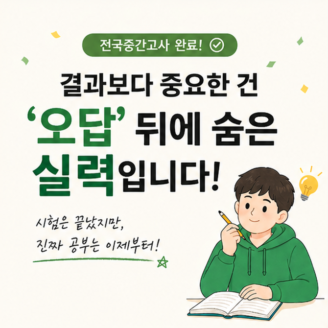 안녕하세요! 아이들과 함께 매일 더 높이 성장하는 오목천동 푸름학원입니다. 지난 4월 24일과 27일, 우리 푸름이들이 2026년 1학기 전국중간고사를 무사히 마쳤습니다. 전국 단위 평가라는 긴장감 속에서도 끝까지 최선을 다해 시험을 치른 우리 아이들 그리고 곁에서 묵묵히 응원해 주신 학부모님들 모두 정말 고생 많으셨습니다. 이제 곧 정밀 분석표가 제공될 예정인데요. 오늘은 시험 점수보다 훨씬 더 중요한 시험 이후의 공부에 대해 이야기해 보려 합니다. 시험은 끝났지만 진짜 공부는 이제부터 시작입니다! 많은 아이가 시험이 끝나면 시험지를 가방 깊숙이 넣어두곤 합니다. 하지만 성적을 바꾸는 진짜 열쇠는 맞힌 문제가 아니....... <img src="https://blogthumb.pstatic.net/MjAyNjA0MjhfMjYz/MDAxNzc3MzQ3MzE1ODg4.s6WwKHJg2A8OD1mTpyu45jvmsNH0f8Yak72or0l2XG0g.iNIXq9LZaI1u2pb_Twkfe4kbmvE0ZI77Ykk7EWz5fqMg.PNG/%BD%BA%C5%A9%B8%B0%BC%A6_2026-04-28_123303.png?type=s3" />