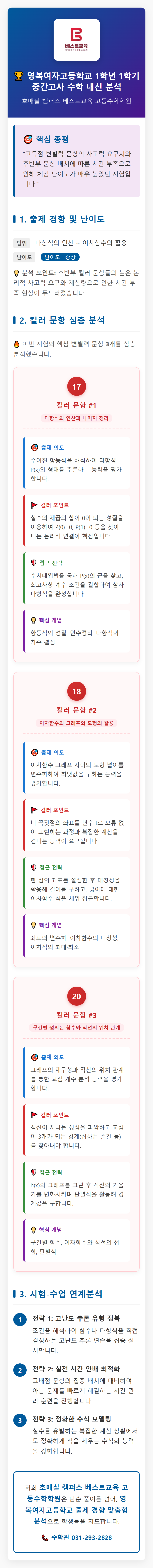 안녕하세요. 호매실영어학원 호매실수학학원 호매실국어학원 베스트학교육 수원금곡캠퍼스입니다 현재 영복여고등학교 1학년 1학기 중간고사 수학 시험 분석이 마무리되어 문항 유형 분석을 해드리겠습니다. 후반부 킬러 문항에서 높은 사고력과 추론 능력이 성적을 가르는 핵심 요소 영복여고 1학년 1학기 중간고사 수학 내신 완전 분석 | 호매실 캠퍼스 베스트교육 고등수학학원 | 영복여자고등학교 1학년 1학기 중간고사 수학 시험을 심층 분석한 결과를 공유드립니다. 시험 난이도: 중상 시험 범위: 다항식의 연산 ~ 이차함수의 활용 이번 시험의 가장 큰 특징은 후반부 킬러 문항의 높은 사고력 요구였습니다. ▲항등식 해석....... <img src="https://blogthumb.pstatic.net/MjAyNjA0MzBfNzcg/MDAxNzc3NTM1NzEyMzU4.zJk_80v7F5sHglN0_k51bJ_kqYGEGiDNvutGKXEICRsg.WX1vB93dzF5f1dpnDHGOfmJWkFiLOhgf-qmYnLTN9ncg.PNG/%BF%B5%BA%B9%BF%A9%B0%ED1_1%C7%D0%B1%E2_%BC%F6%C7%D0_%C1%DF%B0%A3%B0%ED%BB%E7.png?type=s3" />