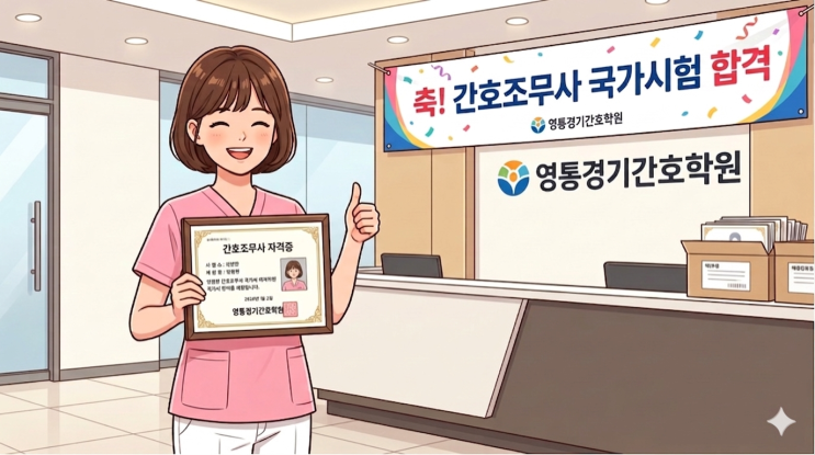간호조무사 자격증 시험 합격률 96.7% 를 자랑하는 영통경기간호학원 3월 시험 합격자들의 자격증이 왔습니다 ^^ ~! 자격증 등장.. ! 학생들에게도 자격증 수령 공지를 해드리고 얼른 블로그를 쓰러 왔습니다 ^^ 이번 시험도 어김없이 제일 먼저 자격증을 수령한 영통경기간호학원입니다 ^^ 간호조무사 자격증 도착 현장 매번 자격증을 직접 받아든 학생들은 “이제 진짜 시작이다”라는 말을 가장 많이 했습니다. 단순히 시험 합격이 아니라 취업으로 이어지는 출발점이기 때문입니다. 이번 기수 합격 포인트 (핵심 전략) ✔ 이론 + 실습 병행 커리큘럼 ✔ 의원급 실습 출결 관리 시스템 운영 (타임스탬프) ✔ 시험 대비 핵심 요약 집....... <img src="https://blogthumb.pstatic.net/MjAyNjA0MjRfMjQw/MDAxNzc2OTk1NDc5MTk0.VxuEBFVGXG8lqDiynRJcNs3X9XZHCiutsbKn65SBRbsg.b_uKWnPzUFrgUyrkGlR3yBqOQUtxKRrCTtfKpXxN2Sog.PNG/KakaoTalk_20260424_104934747.png?type=s3" />