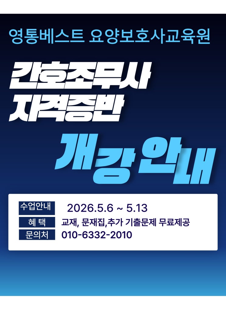 영통베스트요양보호사 교육원이 5/6 개강합니다. 간호조무사 자격증 취득반인데요~ 이론 42시간과 실습 8시간 이수후 시험보시면 됩니다. 이론은 하루 8시간씩 6일간 수업을 하시면 됩니다. 실습은 각자 일정 맞추어 하루만 실습하시면 됩니다. 간호조무사 자격증 소지자는 *이론-42시간 1.노인복지와 장기요양제도 2.인권과 직업윤리 3.기록과 업무보고 4.대상자의 이해 5.의사소통과 정서지원 6.인권보호와 자기계발 7.치매요양보호 *실습-8시간 재가 장기요양기관 요양시설 5월 수업이 어려우신분은 7월에 일반반+ 자격증반 합반으로 개강하니 일정 참고 하시어 예약하시기 바랍니다. 영통 최대규모 이전으로 최신시설과 의료장비 최고의 강사....... <img src="https://blogthumb.pstatic.net/MjAyNjA0MTdfODEg/MDAxNzc2NDI5MjQ4MjEy.-BrtlfDNGHPUPScQOPbEbqV2LHHrzq33T0EETr3T3fAg.Mok8lWmWdq3jSAN3c3_Q5ZwWwhn3Yuk0d_XZ_Fyo0tAg.JPEG/%BF%E4%BE%E7%BA%B8%C8%A3%BB%E7_1_1.jpg?type=s3" />