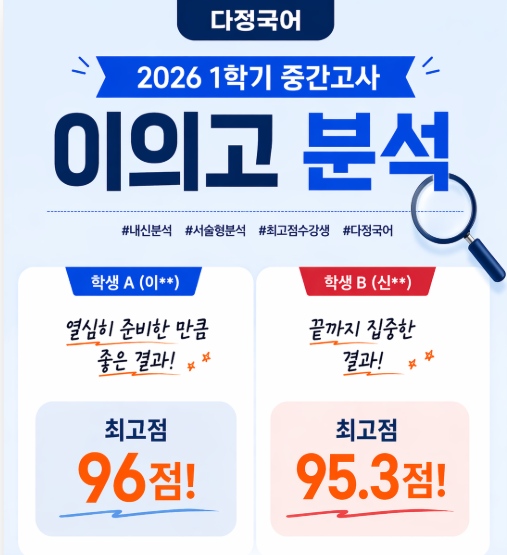 안녕하세요. 다정국어 연구소입니다. 2026년 4월 21일, 이의고 국어 중간고사가 실시되었습니다. 시험 직후 가장 빠르게 이의고 국어 시험을 분석해보겠습니다. [ 문항 수 ] : 24문항 문항 수만 보면 다른 학교에 비해 적은 편이라 쉬워 보일 수 있습니다. 그러나 실제로는 한 문제 한 문제의 밀도가 높아, 문제를 푸는 데 시간이 많이 걸리는 시험입니다. 이번 시험에서도 학생들은 시간 부족함을 느꼈다고 말했습니다. [ 예상 1등급 컷 ] : 2025년과 비슷하게 1등급 컷은 80점대 초,중반에서 형성될 것으로 예상됩니다. 정확한 1등급 컷이 확인되는 대로 다시 수정해 안내드리겠습니다. 다정국어 실적 한 반에 90점대 학생조차 많지 않았던 이....... <img src="https://blogthumb.pstatic.net/MjAyNjA0MjNfMTcy/MDAxNzc2OTM4MDk5NDA5.NMLJINUxGME67YLk2xFT3IKbdHYpzRk1QE7OhFFpwh0g.vUC-F7ubZubDRRj7EzJgJcjKLh5ps8kxquIW4uFliiYg.PNG/image01.png?type=s3" />