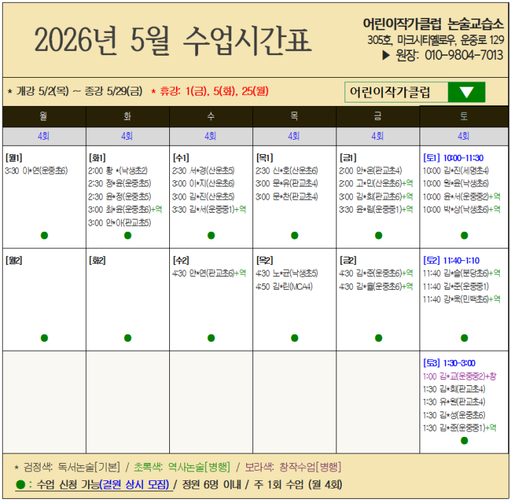 [분당/판교 어린이작가클럽] 2026년 5월 수업시간표 안내