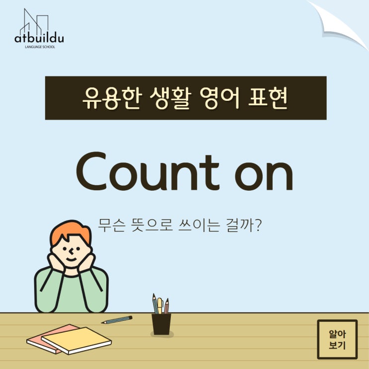 첫 번째 뜻입니다. 어떤 일이 일어나기를 예상하거나 기대하다, 계획에 포함하다. 라고 해석 되는데요, 어떤 일이 일어날것이라고 생각하고, 그에 따른 계획을 세운다는, 흔히 미래에 있을 어떤 일, 상황, 약속, 날씨 등 예측 가능한 일들에 대해, 특히 기대감이 깃들어있다는, 그렇게 되기를 바란다는 뉘앙스로 많이 쓰이게 됩니다. If you count on something or count upon it, you expect and look forward to it to happen and include it in your plans. 두 번째 뜻입니다. 누군가가 나를 도와주거나 지원해주는것에 의지하다. 정도로 해석 되는데요, 누군가가 나를 도와주기를, 나를 지원하고 지지해주길, 약속을 지켜주기를 굳게 믿고 의....... <img src="https://blogthumb.pstatic.net/MjAyNjA0MjRfMjY2/MDAxNzc3MDI3ODIxOTc0.rBTLfBSJcg2DkIUAmuVRZI3MSoVCQafHTnei0B7DQ8cg.PbPKg_Nca78YlUPmsyCyH9Ehr7VIG8w_moGuzPy7l4Eg.JPEG/Count_on_1.jpg?type=s3" />
