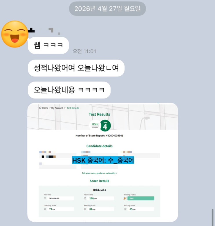 안녕하세요! 오늘은 제가 가르치는 성인 학생의 중국어 학습 이야기를 나누려고 합니다! 이 학생은 오랫동안 중국어를 쉬다가 다시 시작했고, 체계가 잡혀있지 않아서 다시 잡으면서 시작했고, 꾸준한 노력 덕분에 HSK 4급 시험에 합격했답니다! 룰루!!! 처음 수업을 시작했을 때, 언어라는 것은 꾸준히 하는 것이 중요하다 일하면서 무리하지 않는 선에서 수업하는 커리큘럼을 짜서 진행하였고, 온라인 줌 수업 덕분에 언제 어디서든 수업을 들을 수 있다는 점에 매력을 느끼고, 바쁜 일상 속에서도 계속 학습을 이어갔네요!!! 수업을 거듭할수록 실력이 쑥쑥 올라갔고, 처음엔 발음이 어렵다고 했지만, 결국 HSK 4급 시험에 합격! ?....... <img src="https://blogthumb.pstatic.net/MjAyNjA0MjlfMjAx/MDAxNzc3NDQxODYyMjkx.QRO6LLyfec7XcKyBQww5mnNGyQOGyd7NnOttZB5TcUcg.17rC-zaTuqgSr2Orrb_YMzAd2cJ0Y7ZecwC_k1bVRAAg.JPEG/output%A3%DF1256209657.jpg?type=s3" />
