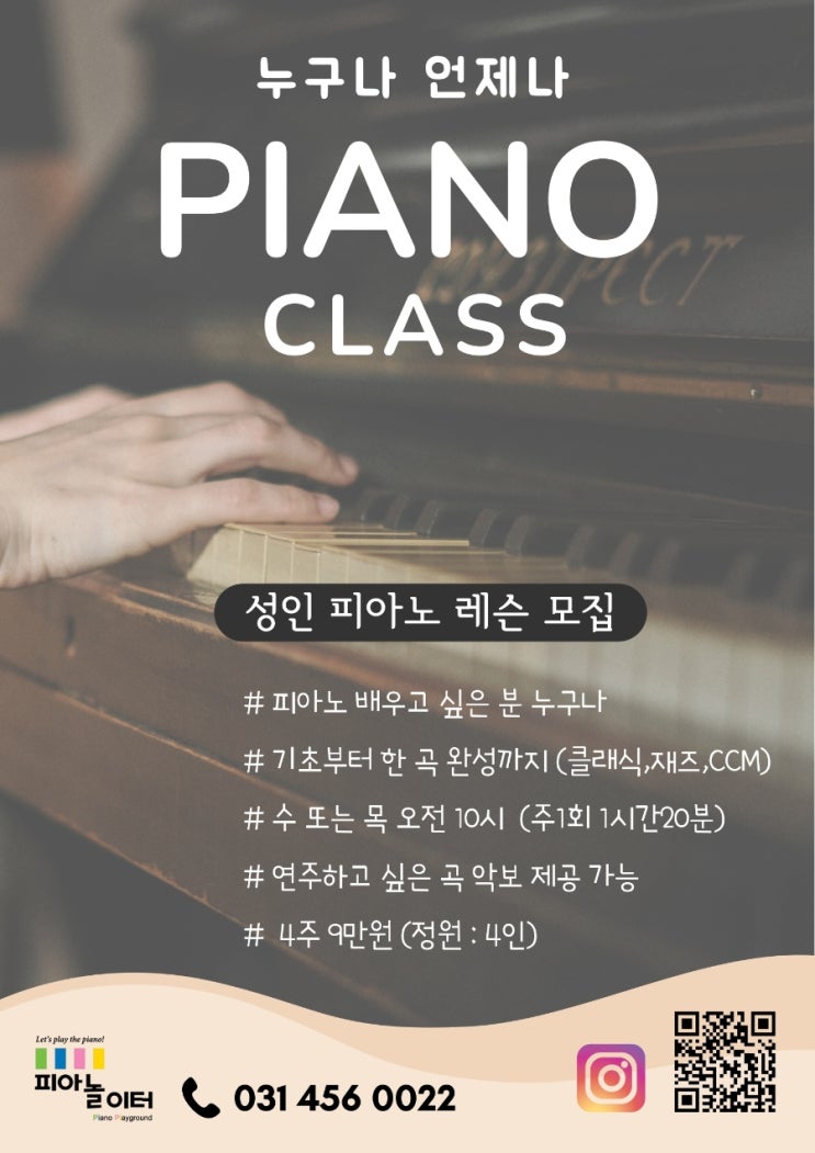 피아놀이터 음악학원의.. "누구나 언제나 Piano Class"를 소개합니다~ 바로 지금이 언제나 몇번이라도.. 피아노를 배워 볼 때입니다~ 피아노를 배우고 싶은 누구나.. 시작할 수 있습니다~ 피아노 레슨은.. 다수의 성인 레슨 및 실용음악 입시 레슨 경력이 있으신 에반스쌤이 전담 레슨하십니다~ 연주하고 싶은 곡의 악보를 개인맞춤 편곡으로 제공 가능합니다~ 코드반주 레슨도 가능합니다~ 에반스쌤은 각종 OST작업, 세션 등 활동하시고.. 현업 가수로 활동중이십니다~ 에반스쌤이 밴드 '오아베'에서 건반 연주하시는 모습입니다~~ 피아노연주의 꿈을.. 피아놀이터음악학원의 "누구나 언제나 Piano Class&quo....... <img src="https://blogthumb.pstatic.net/MjAyNjA0MTJfMjM4/MDAxNzc2MDAwOTkwNjk1.CZEegqNd7mQNUYIeyLv1FLSI4BKQycC8Ko371j4zjqcg.u-m_CdqHtt5G0XCmFdtGtiLXz-JHwtjZlXp1M9fuwtIg.JPEG/900_%BC%F6%B0%AD%BB%FD_%B8%F0%C1%FD_%C6%F7%BD%BA%C5%CD_20260406_105011_0000.jpg?type=s3" />