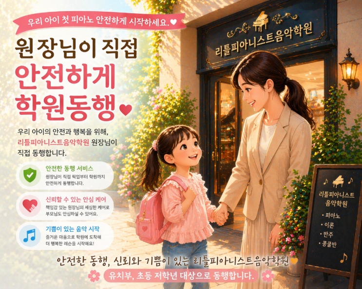 안녕하세요, 리틀피아니스트음악학원입니다 우리 아이의 첫 배움, 설레는 시작만큼이나 안전하게 오가는 길도 참 중요하죠. 그래서 저희 리틀에서는 유치부 및 초등 저학년 친구들을 위한 픽업(동행) 서비스를 시작합니다. 아이들이 혼자 이동하기 어려운 시간, 걱정되셨던 학부모님들을 위해 원장님이 직접 픽업부터 학원 도착까지 함께 동행합니다. ✔ 낯선 길도 안전하게 ✔ 아이 한 명 한 명 세심하게 케어 ✔ 학원 도착 후 안정된 상태에서 수업 시작 단순한 이동이 아닌, 아이의 마음까지 살피는 따뜻한 동행을 약속드립니다. 처음 피아노를 배우는 순간이 더 즐겁고 편안한 기억이 될 수 있도록 리틀피아니스트음악학원이 함께하겠습....... <img src="https://blogthumb.pstatic.net/MjAyNjA0MjBfMTYx/MDAxNzc2NjY0MzEyMTQw.nW0sJwM0R4m2kUc1vRytxac96LghuR68kpmNiFxR-qQg.NzXzQm945_gEjv4hUUg50wS7muzvsmSqfQLxX8tbCUQg.PNG/900_1776522541312.png?type=s3" />