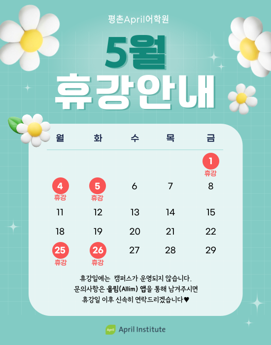 안녕하세요, 평촌에이프릴어학원입니다. 2026년 5월 휴강일 안내 5월 학원 운영 일정과 관련하여 휴강일을 아래와 같이 안내드립니다. 수업 및 등원 일정에 참고 부탁드립니다:) 5월 휴강 일정 5/1(금) ~ 5/5(화) 5/25(월) ~ 5/26(화) ※ 해당 기간에는 정규 수업 및 학원 운영이 진행되지 않습니다. 가정의 달 5월, 소중한 가족과 함께 따뜻한 시간 보내시길 바랍니다 ♥️ 앞으로도 아이들의 꾸준한 성장을 위해 최선을 다하겠습니다. 감사합니다! 성장하는 '초등 영어 사고력' [평촌 에이프릴어학원 입학시험 바로가기] <img src="https://blogthumb.pstatic.net/MjAyNjA0MjJfMjI5/MDAxNzc2ODM5MzEwODQy.Uer9rTvrAI9mPJLmJOkjq9cNaDufqk63rNFJBRBGASAg.xfTx-Zh-Cw9hKz7AIDq9MNM3ztRizQxkiUORbguhTN8g.PNG/%C6%CB%BE%F7%BF%EB-700px-001_%281%29.png?type=s3" />